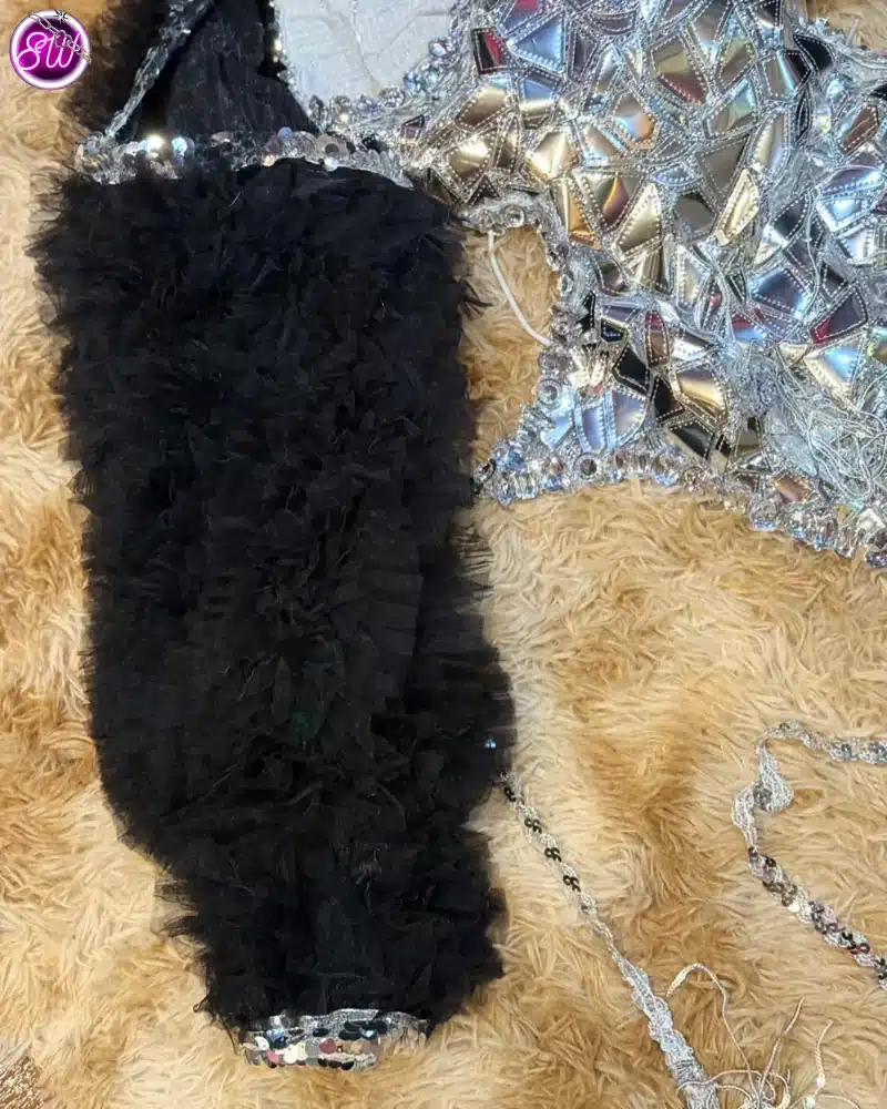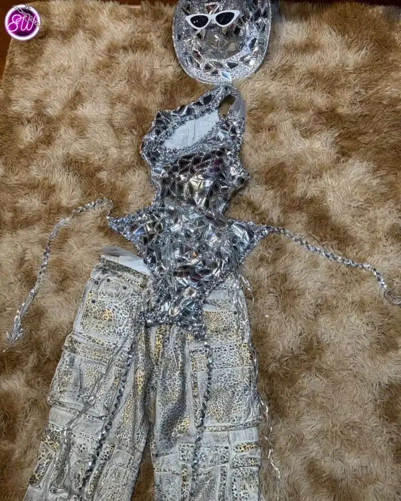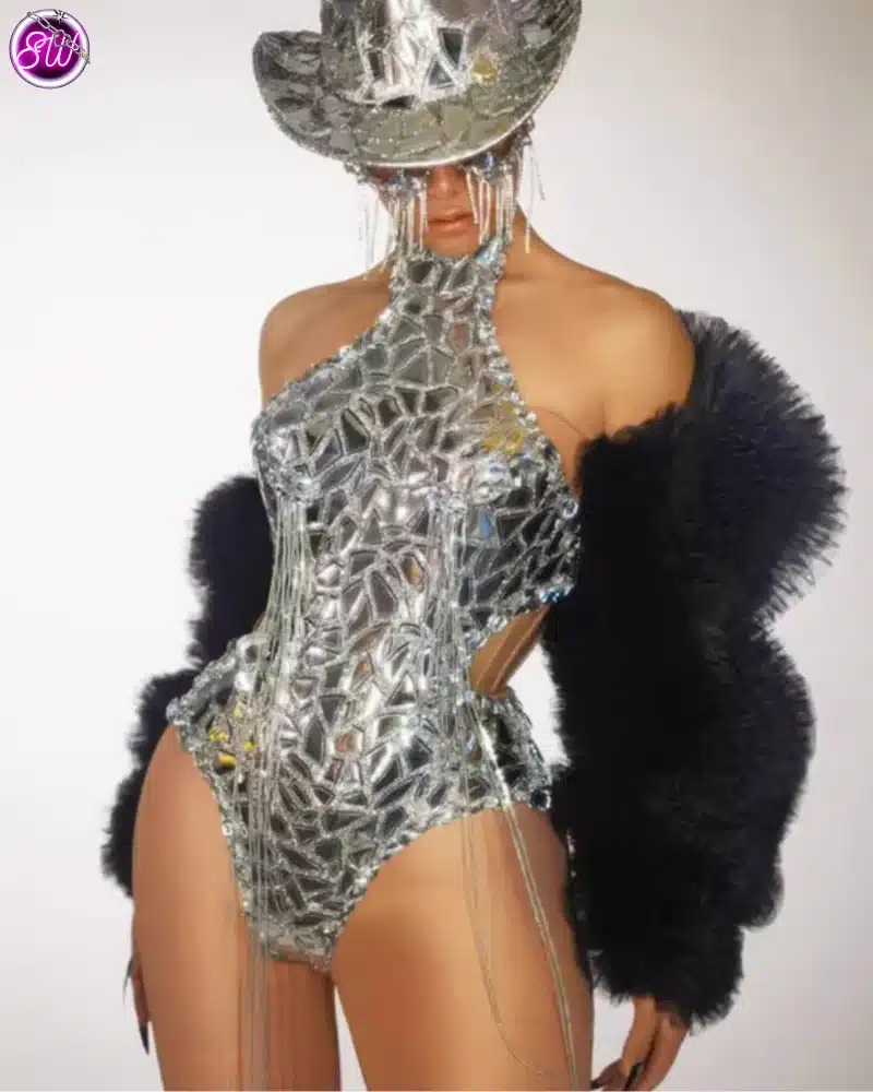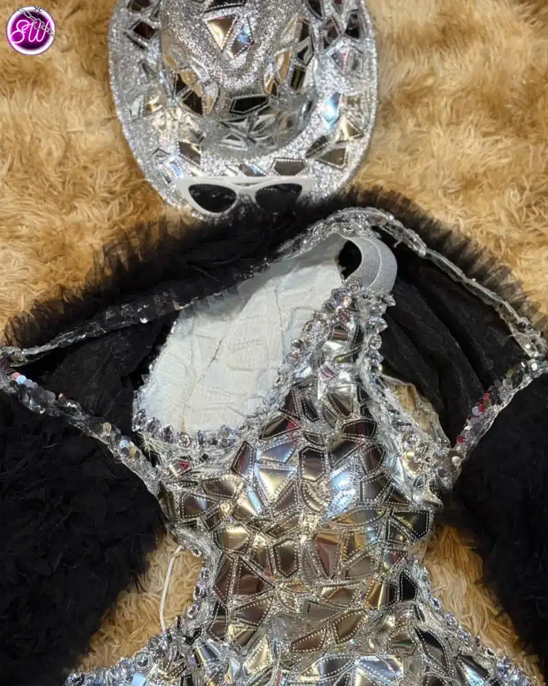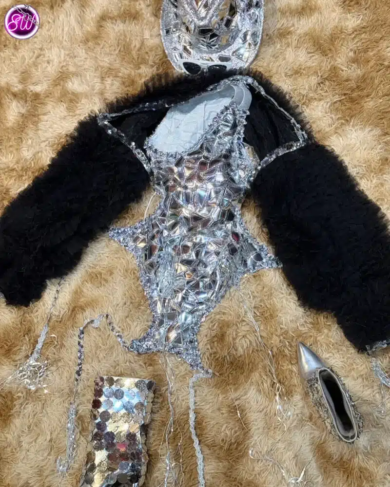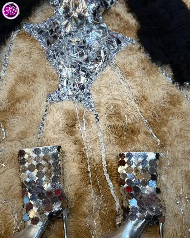| Outfit Information | ชุดจั๊มสูทสีเงิน เสื้อคลุมขนสีดำ และหมวกสีเงิน กางเกงขายาวสีเงินทรงหลวม รองเท้าบูทสีเงิน แว่นกันแดดสีขาว |