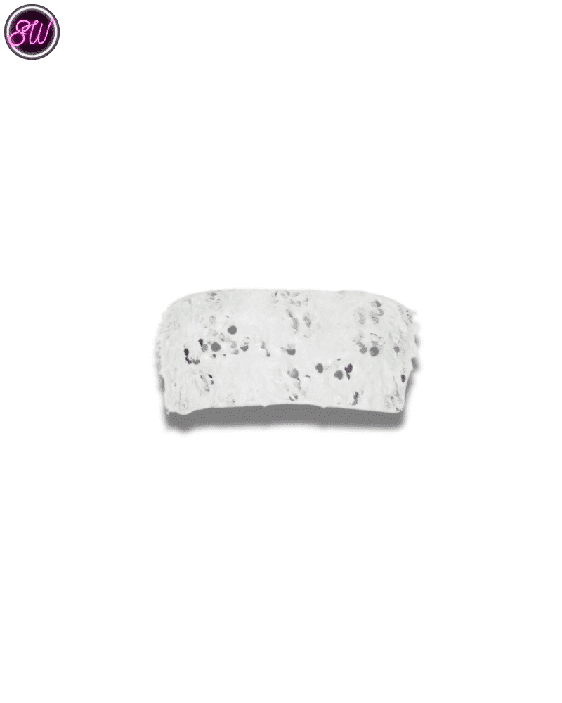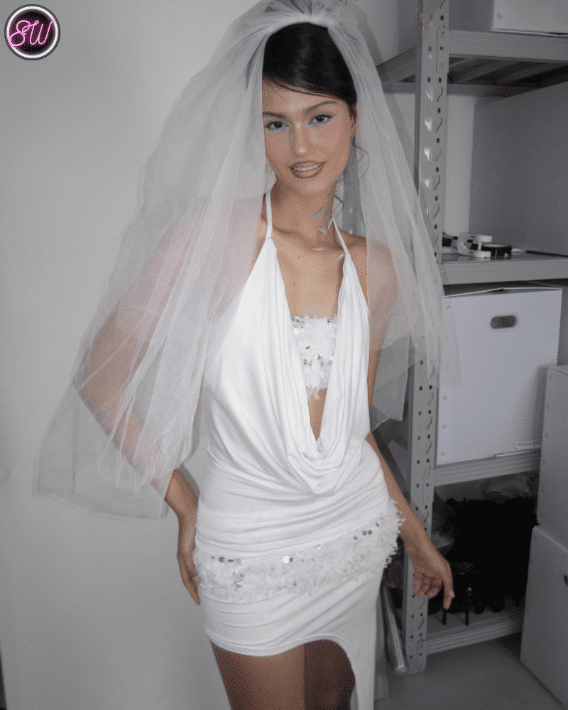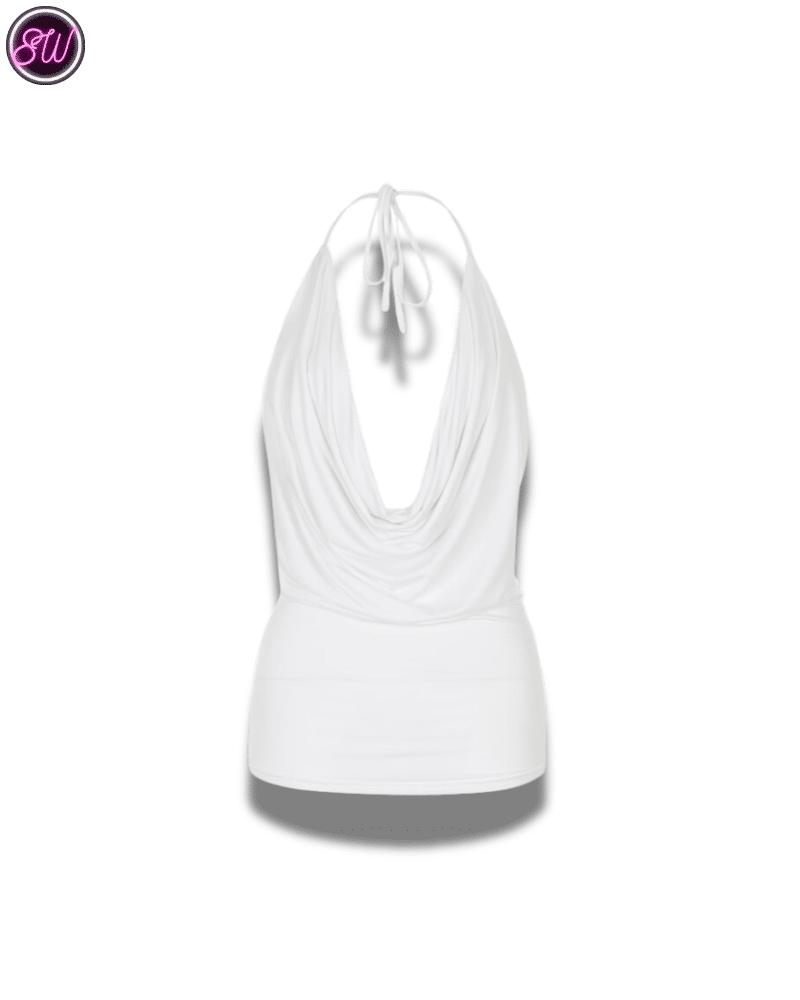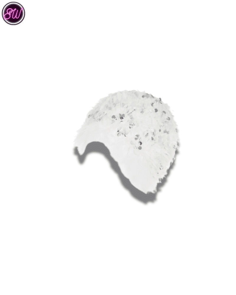 เรียงตามสี: เสื้อคอฮอลเตอร์สีขาวมีในสต็อก, เสื้อท่อนบนปักเลื่อมขนนกสีขาวมีในสต็อก, กระโปรงทรงไม่สม่ำเสมอสีขาวมีในสต็อก, หมวกปักเลื่อมขนนกสีขาว